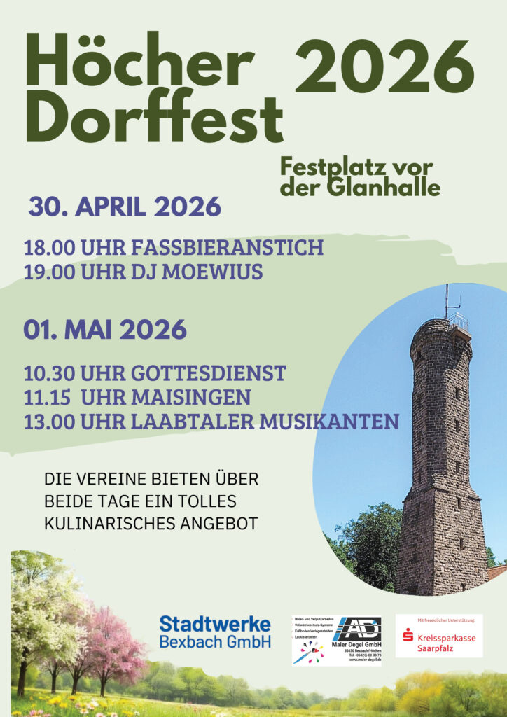 Wir feiern an der Glanhalle und beginnen am 30. April mit einem Fassbieranstich. Mit leckerem Essen und Getränken feiern wir entspannt in die Hexennacht. Ortsvorsteherin Eva-Maria Scherer wird bei hoffentlich bestem Wetter und jeder Menge „Gutelaunegäste“ das Dorffest 2026 um 18.00 Uhr eröffnen. Ab 19.00 Uhr wird DJ Markus Moewius die Gäste unterhalten. Moewius ist seit über 10 Jahren in der elektronischen Musik zu Hause und als DJ und Entertainer nicht nur hier bei uns im Saarland gefragt – auch überregional begeistert er die Menschen. Mit Gottes Segen beginnt der 1. Mai um 10.30 Uhr mit einem ökumenischen Gottesdienst im Dorfgemeinschaftsraum. Die Chormäuse haben sich angesagt und werden den Gottesdienst begleiten. Anschließend, gegen 11.15 Uhr, begrüßt der gemischte Chor des MGV den Frühling. Traditionell zur guten Laune, Lebensfreude und Frohsinn aller hören wir den munteren Gesang des Chores unter der Leitung von Christina Kaiser. Ab 13.00 Uhr geben die Laabtaler Musikanten mit stimmungsvollen Klassikern ihr Bestes für tolle Unterhaltung und gute Stimmung. Viel für die Kinder hat der Förderverein des Kindergartens geplant. Allerlei Überraschungen warten am Stand des Fördervereins für die kleinsten Dorffestgäste. Ein Rahmenprogramm für die Kinder, das sich sehen lassen kann. Der Festplatz vor der Halle wird für zwei Tage zum Mittelpunkt der Dorfgemeinschaft. Da bleibt keiner zu Hause und kocht selber! Die Macher haben wieder eine Außenküche vom Feinsten installiert. An alle Geschmäcker ist gedacht, in breiter Vielfalt, für Jeden etwas wird für das leibliche Wohl gesorgt sein. Für die Liebhaber süßer Köstlichkeiten ist unser großes Kuchenbuffet am 1. Mai bekannt. Tolle Kuchen in Handarbeit von den Kuchenbäckerinnen und Kuchenbäcker hergestellt dürfen natürlich nicht fehlen.